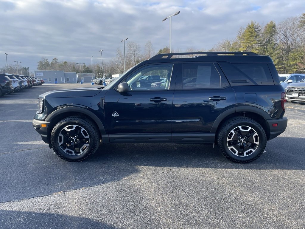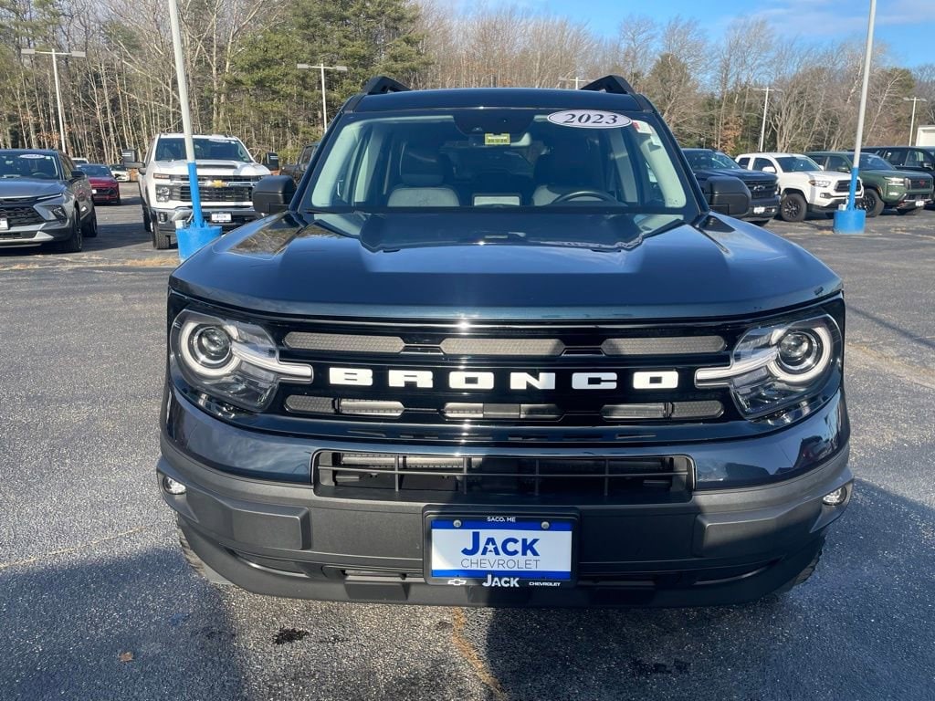 The 2023 Ford Bronco Sport Outer Banks is built for adventure with a splash of style and comfort to match. Rugged and refined, it carries the iconic Bronco attitude with a confident stance, bold grille, and unmistakable design thatâs always ready for the next escape, whether thatâs a winding mountain road, a sandy shoreline, or a spontaneous weekend getaway. Inside, the Outer Banks turns every drive into a first-class expedition. Heated front seats and a heated steering wheel keep you warm on chilly mornings, while smart, modern tech features keep you connected and in control wherever the road leads. The thoughtfully designed cabin blends comfort and capability, making long drives feel effortless and daily commutes feel anything but ordinary.4-Wheel Disc Brakes, 4G LTE Wi-Fi Hotspot Credit, 6 Speakers, ABS brakes, Air Conditioning, Alloy wheels, AM/FM radio: SiriusXM, AM/FM Stereo, Auto High-beam Headlights, Auto-dimming Rear-View mirror, Automatic temperature control, Brake assist, Compass, Delay-off headlights, Driver door bin, Dual front impact airbags, Dual front side impact airbags, Electronic Stability Control, Emergency communication system: SYNC 3 911 Assist, Equipment Group 300A, Four wheel independent suspension, Front anti-roll bar, Front Bucket Seats, Front Center Armrest, Front dual zone A/C, Front fog lights, Fully automatic headlights, Heated door mirrors, Heated front seats, Heated steering wheel, Illuminated entry, Knee airbag, Leather Trimmed Heated Sport Contour Bucket Seats, Low tire pressure warning, Memory seat, Occupant sensing airbag, Outside temperature display, Overhead airbag, Overhead console, Painted Shadow Black Roof, Panic alarm, Passenger door bin, Power door mirrors, Power driver seat, Power passenger seat, Power steering, Power windows, Radio data system, Rain sensing wipers, Rear anti-roll bar, Rear Parking Sensors, Rear seat center armrest, Rear window defroster, Rear window wiper, Remote keyless entry, Security system, SiriusXM, Speed control, Speed-sensing steering, Speed-Sensitive Wipers, Split folding rear seat, Steering wheel mounted audio controls, SYNC 3 Communications & Entertainment System, SYNC 3/Apple CarPlay/Android Auto, Telescoping steering wheel, Tilt steering wheel, Traction control, Variably intermittent wipers.CARFAX One-Owner.Free delivery up to 25 miles! Call or Email to schedule your VIP Appointment. 207-284-5986.Make your purchase with confidence -- we offer a 3-day exchange on all used vehicle purchases. If you live within 25 miles of us, we'll be happy to deliver your vehicle to you at no charge.